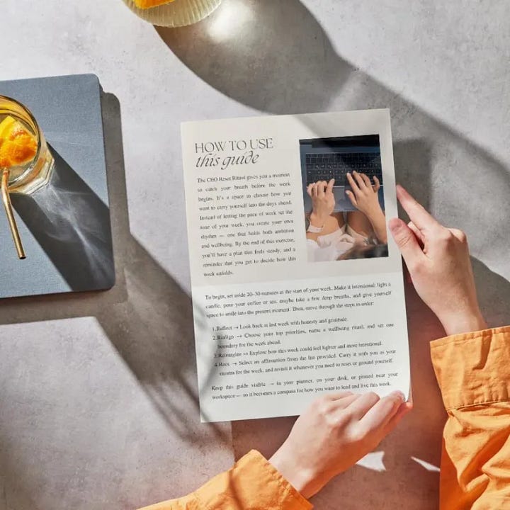Monday: Downloadable resources (Paid) — workbooks, digital tools, and guided rituals to help you live with intention and build the life you’re craving.
