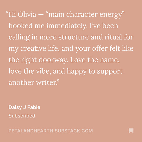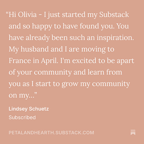For the cost of a dinner out this month, you can unlock the full Petal + Hearth experience: weekly downloads, private essays, and access to the growing Member Vault of resources designed to help you romanticize your everyday life.