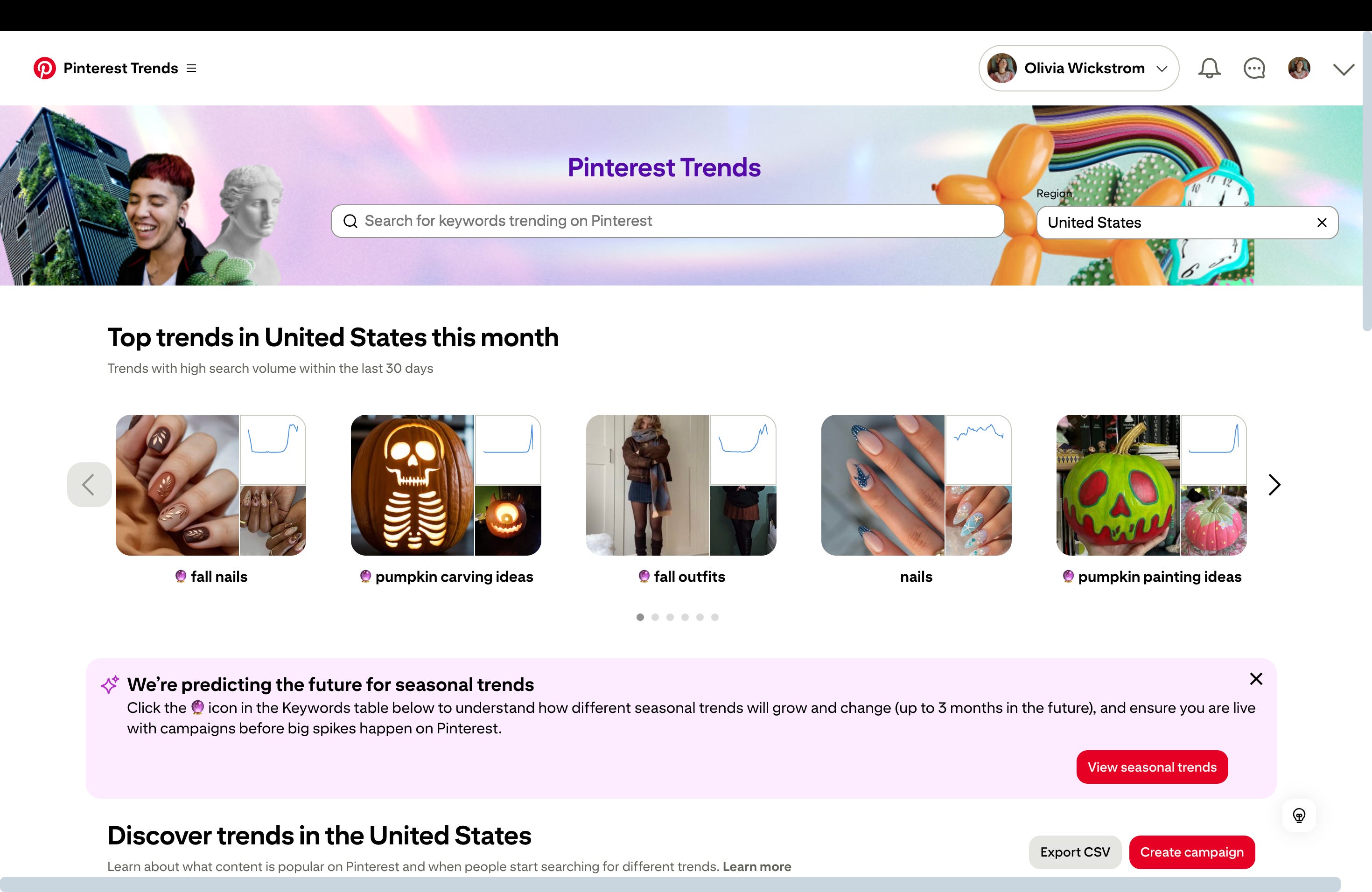 Pinterest Trends is a built-in tool that shows what people in your region are searching for right now. It updates constantly, and the data is pulled directly from what users are typing into the search bar. When you open it, you’ll see a list of trending topics and search phrases, often grouped by season, holiday, aesthetic, or category.